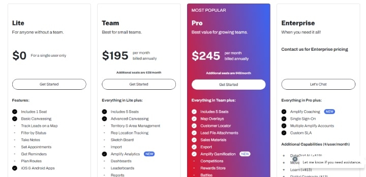 The Pro plan costs $245/month for 5 seats, with additional seats for $49/month. It includes everything from the Team plan, plus features like map overlays, customer locator, sales materials, scorecards, achievements, Amplify Gamification, custom integrations, and more.