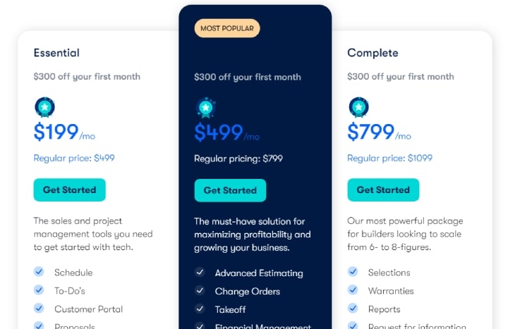 The Pro plan costs $199/month (billed annually). It covers everything in Essential, plus change orders, premium support, project schedules, and subcontractor management.