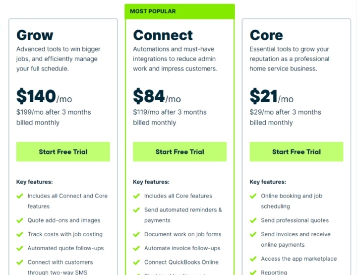 Jobber offers a free 14-day trial of their software with no credit card required. After the trial, you can select from any of the following plans. Each plan offers annual and monthly subscription options.