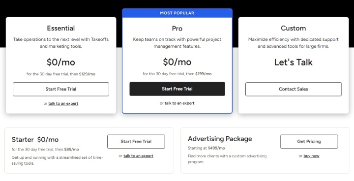 Houzz Pro offers 4 pricing plans: Starter, Essential, Pro, and Custom. You can try any of the plans out with a 14-day free trial.
