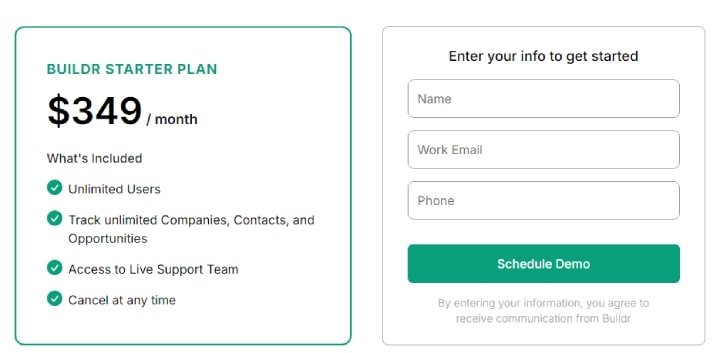 Buildr’s Starter plan costs $349 per month. The Starter plan allows you to add unlimited users and track unlimited contacts, companies, and opportunities.